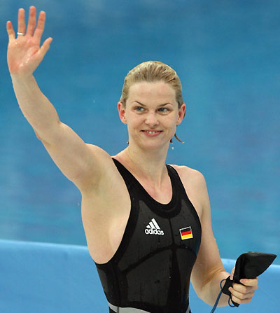 Germany's Britta Steffen waves after winning the women's 50m freestyle swimming final at the National Aquatics Center during the 2008 Beijing Olympic Games in Beijing on August 17, 2008. Britta Steffen of Germany won the Olympic Games women's 50m freestyle gold medal in an Olympic record time of 24.06. US swimmer Dara Torres was second and Australian Cate Campell was third.[Agencies]