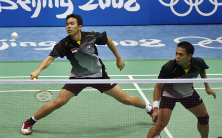 Markis Kido and Hendra Setiawan (L) of Indonesia compete with Cai Yun and Fu Haifeng of China at the men's doubles finals of the 2008 Olympic Games badminton match, in Beijing, August 16, 2008. Markis Kido and Hendra Setiawan won the match 2-1.[Xinhua]