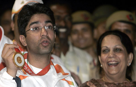 Olympic men's 10m air rifle gold medalist Abhinav Bindra displays his gold medal upon his arrival as his mother Babli Bindra (R) watches on at the airport in New Delhi August 14, 2008. Ecstatic India lavished praise and nearly $400,000 in cash on shooter Bindra after he won the first solo Olympic title for a medal-starved nation. [Agencies]