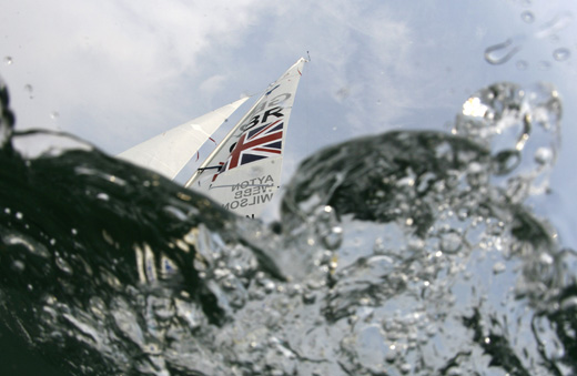 Defending gold medallists Sarah Ayton, Sarah Webb and Pippa Wilson of Britain, competing in Yngling class, wait for the start of the medal race at the Beijing 2008 Olympic Games in Qingdao, Shandong province, August 16, 2008. The race was postponed to Sunday. Photo taken with an underwater camera. [Agencies]