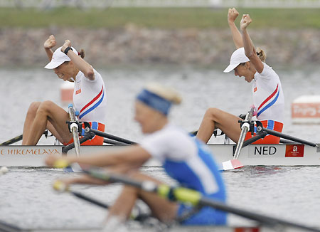 Kirsten van der Kolk (R) and Marit van Eupen (L) of the Nederlands celebrate wining the women's double sculls rowing final of the Beijing 2008 Olympic Games at Shunyi Olympic Rowing-Canoeing Park north of Beijing, August 17, 2008.[Agencies]
