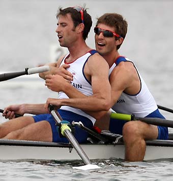 Britain's Zac Purchase and Mark Hunter (L) celebrate after finishing the lightweight men's double sculls at the Shunyi Rowing and Canoeing Park in Beijing on August 17, 2008. Netherland won the race. Britain won the race. [Agencies] |