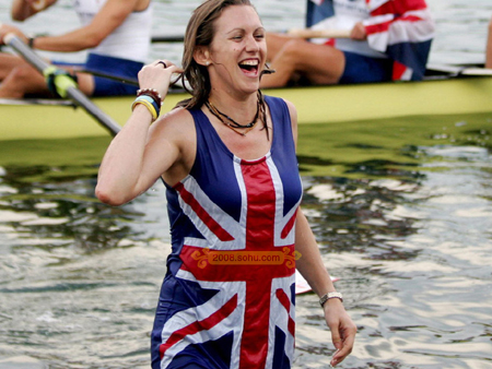 UK supporter laughs when Britain won a gold medal in a thrilling men's coxless four race on August 16, 2008.