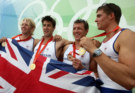 Britain's Tom James, Steve Williams, Pete Freed and Andrew Triggs Hodge celebrate following the medals ceremony for the men's four at the Shunyi Rowing and Canoeing Park during the 2008 Beijing Olympic Games in Beijing on August 16, 2008.