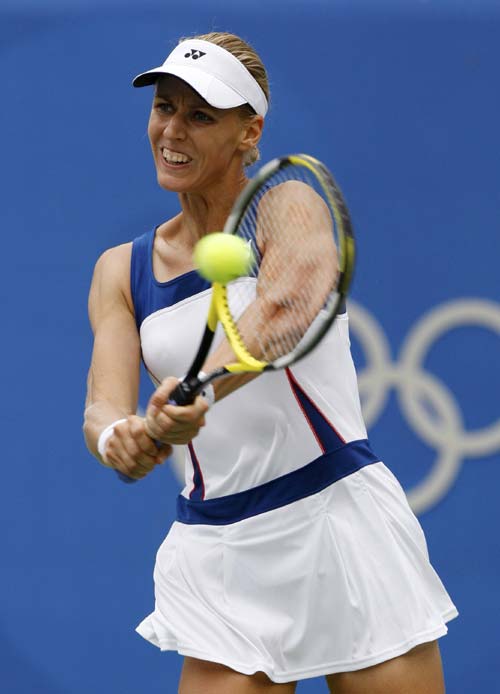Elena Dementieva of Russia returns the ball to her compatriot Dinara Safina during their women's singles final tennis match at the Beijing 2008 Olympic Games August 17, 2008.[Agencies]