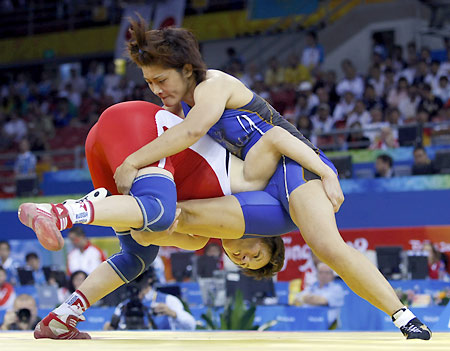 Alena Kartashova of Russia (in red) fights Kaori Icho of Japan during their 63 kg women's gold medal freestyle wrestling match at the Beijing 2008 Olympic Games August 17, 2008. [Agencies]
