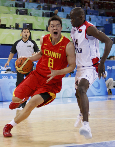 Zhu Fangyu of China (L) drives to the basket against Leonel Paulo of Angola during their men's Group B basketball game at the Beijing 2008 Olympic Games, August 14, 2008. [Agencies]