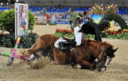 Brazilian rider Pedro Veniss falls from his horse Un Blanc De Blancs during the jumping individual 2nd qualifier and jumping team round 1 of the Beijing 2008 Olympic Games equestrian events in the Olympic co-host city of Hong Kong, south China, Aug 17, 2008. Pedro was eliminated from the competition after he fell off his horse. [Xinhua]
