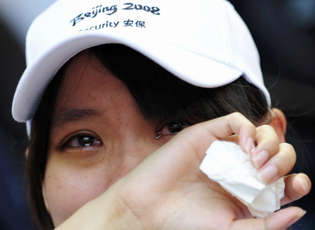 A supporter cries after China's Olympic champion Liu Xiang failed to start his 110 metres hurdles first-round heat of the athletics competition at the Beijing 2008 Olympic Games, August 18, 2008. After one false start Liu stopped before the first hurdle clutching his leg and then walked out of the stadium. [Agencies]