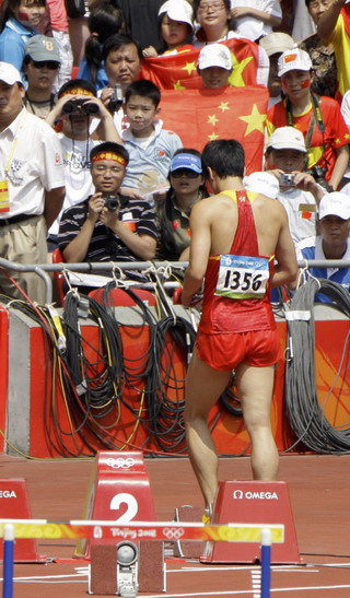 Liu Xiang of China leaves the track without starting his 110m hurdles heat of the athletics competition in the National Stadium at the Beijing 2008 Olympic Games August 18, 2008. After one false start Liu stopped before the first hurdle clutching his leg and then walked out of the stadium. [Agencies]