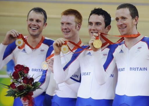 (L-R) Great Britain's track cyclists Paul Manning, Ed Clancy, Geraint Thomas and Bradley Wiggins pose for photographers after winning the gold medal in the 2008 Beijing Olympic Games men's team pursuit finals at the Laoshan Velodrome in Beijing on August 18, 2008. [Agencies] |