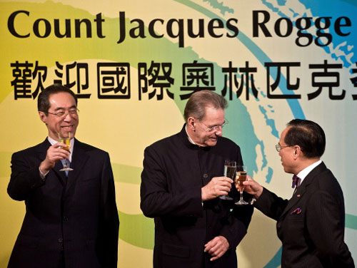 Rogge has a toast at a welcoming reception in HK