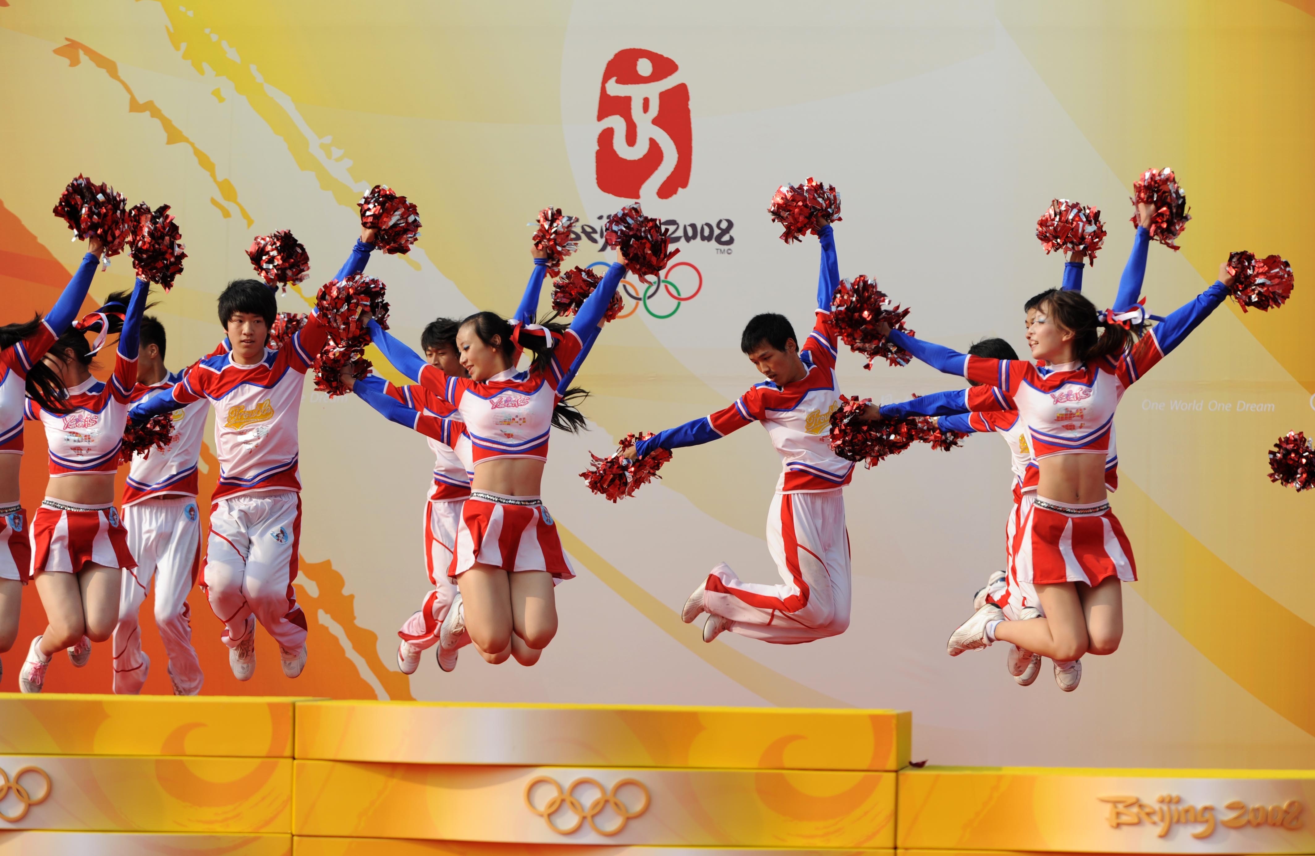 | Cheerleaders perform during presentations of sailing medals at the 2008 Beijing Olympic Games in Qingdao, Shandong province on August 18, 2008. [Xinhua] |
