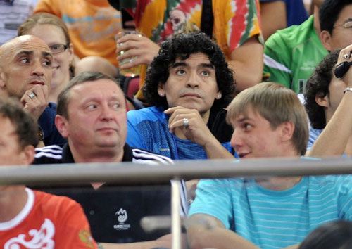 Argentina's football star Diego Armando Maradona (C) attends the men's preliminary round group A basketball match Argentina vs Russia, on August 18, 2008 at the Olympic Basketball Arena in Beijing, as part of the 2008 Beijing Olympic Games.[Agencies]