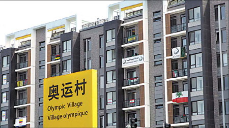 The Olympic Village where athletes display their countries' national flags from the balconies and windows. [China Daily]