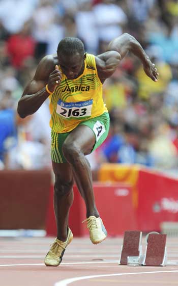 Usain Bolt of Jamaica sprints during his men's 200m heat of the athletics competition in the National Stadium at the Beijing 2008 Olympic Games August 18, 2008.[Agencies]