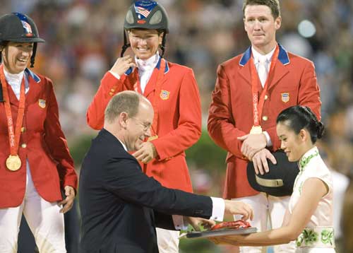 Prince Albert of Monaco takes the final gold medal from the tray to give to the U.S. showjumping team for the team equestrian showjumping of the Beijing 2008 Olympic Games in Hong Kong August 18, 2008.[Agencies]