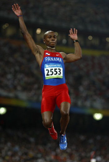 Panama's Irving Jahir Saladino Aranda competes during the men's long jump final at the "Bird's Nest" National Stadium during the 2008 Beijing Olympic Games on August 18, 2008. Saladino took gold.[Agencies]