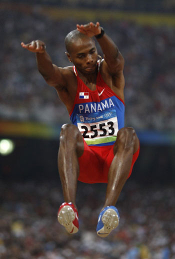 Panama's Irving Jahir Saladino Aranda competes during the men's long jump final at the "Bird's Nest" National Stadium during the 2008 Beijing Olympic Games on August 18, 2008. Saladino took gold.[Agencies]