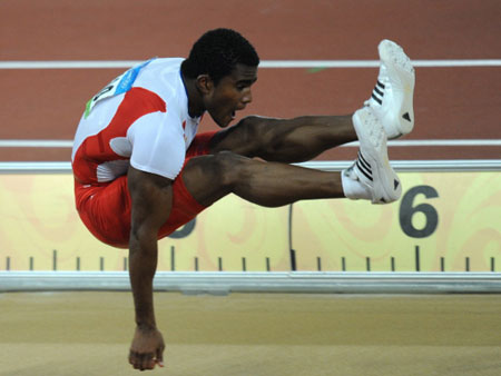 Cuba's Ibrahim Camejo competes during the men's Long Jump final at the National Stadium as part of the 2008 Beijing Olympic Games on August 18, 2008. Panama's Irving Jahir Saladino Aranda won ahead of South Africa's Khotso Mokoena and Cuba's Ibrahim Camejo.[Agencies]