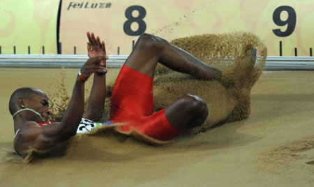Panama's Irving Jahir Saladino Aranda competes during the men's Long Jump final at the National Stadium as part of the 2008 Beijing Olympic Games on August 18, 2008. Panama's Irving Jahir Saladino Aranda won ahead of South Africa's Khotso Mokoena and Cuba's Ibrahim Camejo.[Agencies]