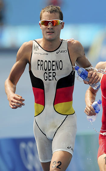 Frodeno held off a late charge by Canadian Simon Whitfield to finish in 1:48.53. Whitfield had to settle for the silver in 1:58.58.