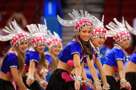 Cheerleaders perform during the men's preliminary round group B basketball match China vs. Greece at the Beijing Olympic Basketball Gymnasium on August 18, 2008. China lost 91-77 to Greece. [sina.com.cn]