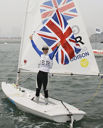 Paul Goodison of Britain,sailing in the Laser class, waves after winning gold at the Beijing 2008 Olympic Games in Qingdao, Shandong province, August 19, 2008. [Agencies]