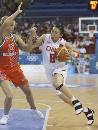 Miao Lijie of China (R) drives to the basket against Tatyana Troina of Belarus during their women's quarterfinal basketball game at the Beijing 2008 Olympic Games August 19, 2008. [Agencies]
