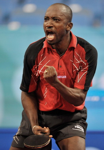 Nigeria's Segun Toriola celebrates after defeating David Zhuang of the US in their men's singles preliminary round table tennis match at the 2008 Beijing Olympic Games on August 19, 2008. [Agencies]