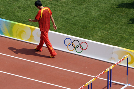 Liu Xiang walks away from the track as he retires from the first round of the men's 110m hurdles at the "Bird's Nest" National Stadium during the 2008 Beijing Olympic Games on August 18, 2008. [Agencies]