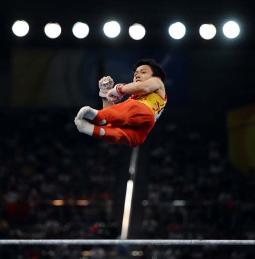 China's Zou Kai competes in the men's horizontal bars final of the artistic gymnastics event of the Beijing 2008 Olympic Games in Beijing on August 19, 2008. China's Zou Kai won the gold, United States' Jonathan Horton the silver and Germany's Fabian Hambuechen the bronze. [Agencies]