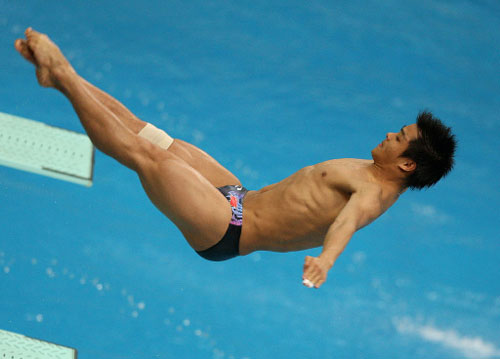 He Chong from China performs a dive during the final of the men's 3m springboard at the 2008 Beijing Olympic Games on August 19, 2008.[Agencies]