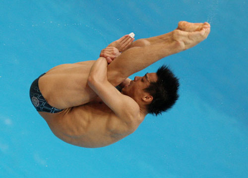 He Chong of China competes in the semi-finals of the men's 3m springboard diving event at the 2008 Beijing Olympic Games on August 19, 2008. [Agencies]