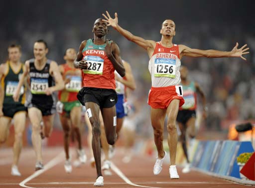 Bahrain's Rashid Ramzi (R) celebrates after crossing the finish line to win gold in the men's 1500m race at the "Bird's Nest" National Stadium during the 2008 Beijing Olympic Games on August 19, 2008. Ramzi handed Bahrain its first-ever Olympic medal when he won the men's 1500m gold medal in 3min 32.94sec. Kenya's Asbel Kipruto Kiprop claimed silver in 3:33.11 with New Zealand's Nicolas Willis winning bronze in 3:34.16. [Agencies]