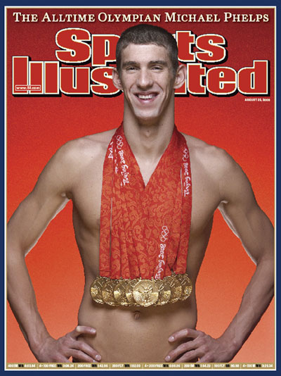 U.S. swimmer and all-time Olympian Michael Phelps poses exclusively for the August 25, 2008 edition of Sports Illustrated in this photograph taken in Beijing, China on August 17, 2008. This photo of Phelps, 23, posing with his eight medal collection, the richest gold medal haul ever from a single Olympic Games, marks Phelps' fifth appearance on the cover of Sports Illustrated. Phelps has more SI covers than any other swimmer including Mark Spitz, who is second with three. The August 25, 2008 issue of Sports Illustrated will go on sale on Wednesday. Photo taken August 17, 2008.[Agencies]