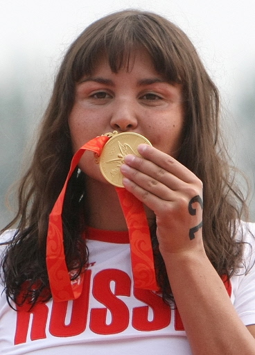 Russia's Larisa Ilchenko kisses her gold-mead during the medal ceremony following the Women's Swimming 10 km marathon final of the 2008 Beijing Olympic Games at the Shunyi Rowing and Canoeing Park in Beijing on August 20, 2008. Russia's Larisa Ilchenko won the gold medal, with Great Britain's Keri-Anne Payne and Cassandra Patten claiming the silver and bronze respectively.[Agencies]