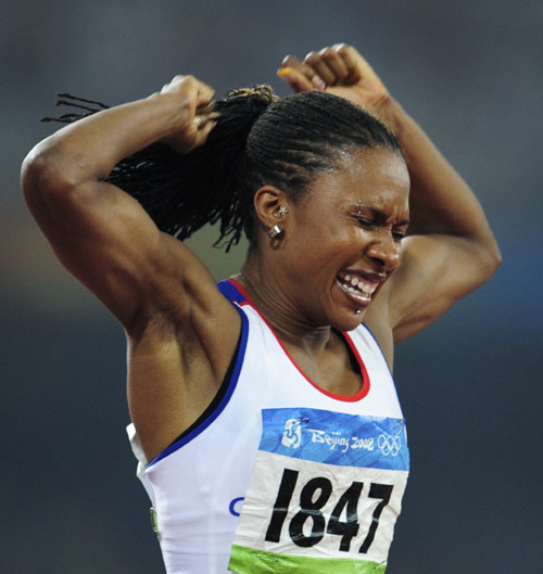 Tasha Danvers of Britain celebrates after coming in third in the women's 400m hurdles final of the athletics competition in the National Stadium at the Beijing 2008 Olympic Games August 20, 2008.[Agencies]