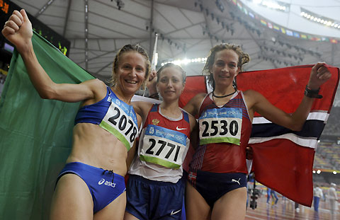 Winner Olga Kaniskina of Russia poses with second-placed Kjersti Platzer (R) of Norway and third-placed Elisa Rigaudo (L) of Italy after the women's 20km walk of theathleticscompetition in the National Stadium at the Beijing 2008 Olympic Games August 21, 2008.[Agencies]