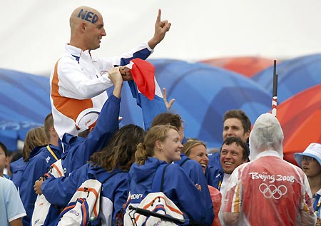 Maarten van der Weijden of the Netherlands is lifted up by his teammates after winning the men's marathon 10km swimming competition at the Beijing 2008 Olympic Games, August 21, 2008. [Agencies]