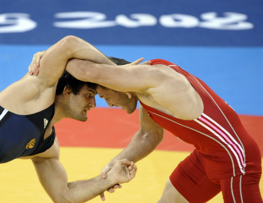 Russia's Shirvani Muradov (blue) fights with Kazakhstan's Taimuraz Tigiyev (red) during their men's wrestling 96kg freestyle gold medal match at the China Agricultural University Gymnasium in Beijing on August 21, 2008, as part of the 2008 Beijing Olympic Games. [Agencies]