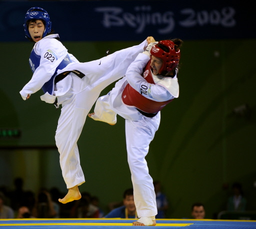 Lim Sujeong (blue) of South Korea fights with Veronica Calabrese of Italy in the semifinal of the women's -57 kg taekwondo match during the 2008 Beijing Olympic Games in Beijing on August 21, 2008. [Agencies] |