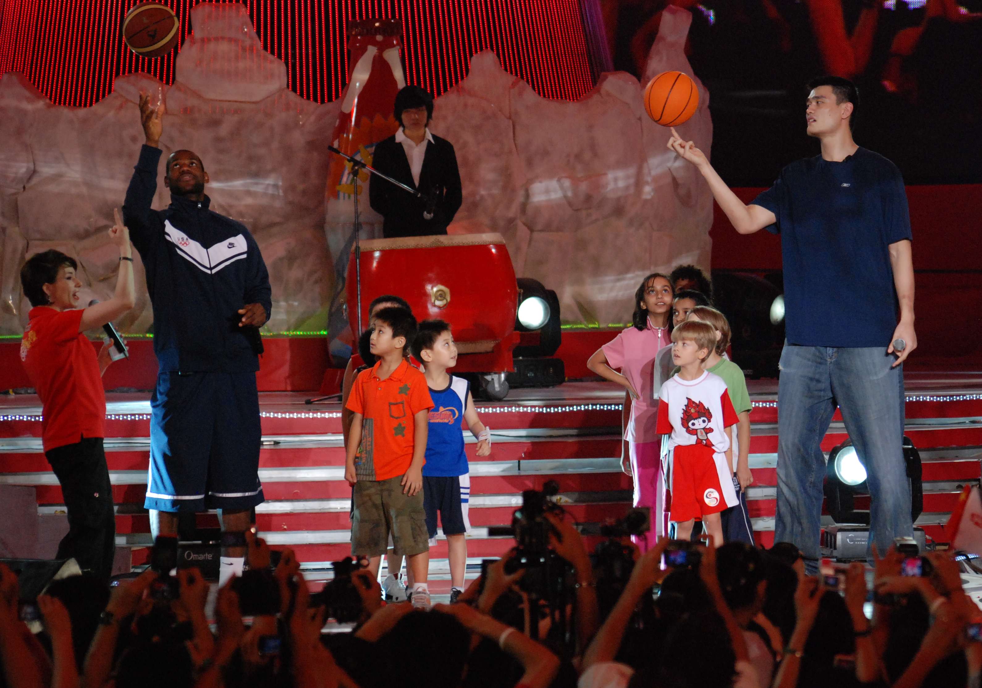 NBA stars LeBron James (2nd L) and Yao Ming (R) play a basketball game with kids during a promotion show for Olympics in Beijing on August 21, 2008. [Xinhua]