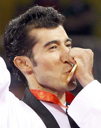 Gold medallist Guillermo Perez of Mexico poses during the medal ceremony for the men's -58kg taekwando competition at the Beijing 2008 Olympic Games August 20, 2008. [Agencies]
