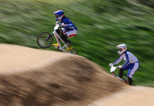 Anne-Caroline Chausson (L) of France competes in the women's BMX cycling, August 22, 2008. Chausson won the gold medal in the event. [BOCOG]