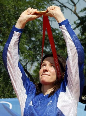 Anne-Caroline Chausson of France poses with her gold medal after winning the women's final run for the BMX cycling competition at the Beijing 2008 Olympic Games August 22, 2008. [Agencies]