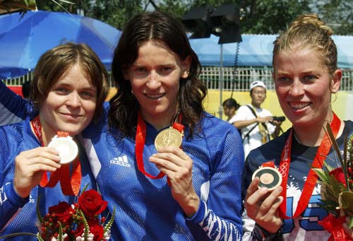 Gold medallist Anne-Caroline Chausson of France, silver medallist Laetitia le Corguille of France and bronze medallist Jill Kintner of the U.S. show their medals after the women's BMX cycling competition at the Beijing 2008 Olympic Games August 22, 2008. [Agencies]