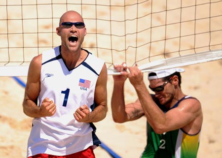Philip Dalhausser of the US (L) celebrates winning a point as Brazil's Fabio Magalhaes (R) picks himself up off the sand during the men's final beach volleyball match at Beijing's Chaoyang Park Beach Volleyball Ground on August 22, 2008 during the 2008 Beijing Olympic Games. [Agencies]