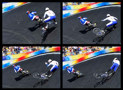 The combo shows Britain's Shanaze Reade falls during the women's BMX finals at the 2008 Beijing Olympic Games at the Laoshan BMX venue on August 22, 2008. [Xinhua]