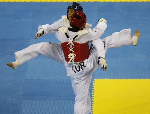 Taejin Son of Korea (Back) fights with Mark Lopez of USA during taekwondo men's 68 kg final matche during the 2008 Beijing Olympic Games in Beijing on August 21, 2008. Son Taejin of South Korea won gold, Mark lopez of the US took silver and Sung Yu-Chi of Chinese Taipei and Servet Tazegul of Turkey claimed bronze.[Agencies]